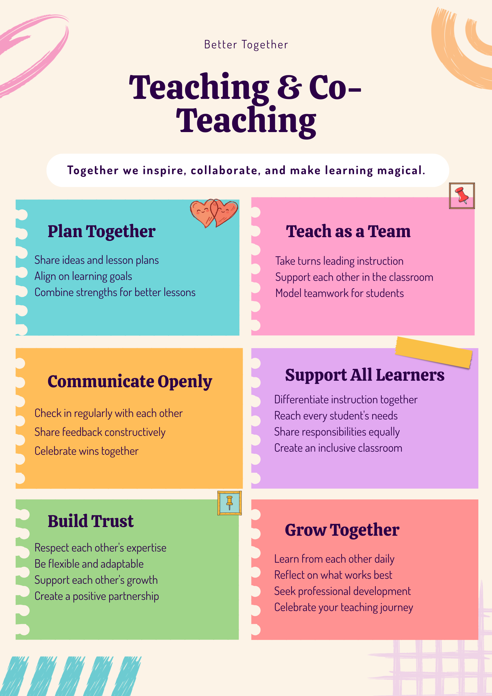 Two teachers, one classroom, endless possibilities! The Co-Teaching Toolbox is here to help you plan smarter, teach together, and create a space where all students feel supported, confident, and ready to learn. This space created for educators who believe all students deserve access, support, and meaningful learning. Whether you’re new to co-teaching or looking to strengthen your practice, you’ll find tools, ideas, and inspiration to help you build an inclusive classroom where every student can succeed.